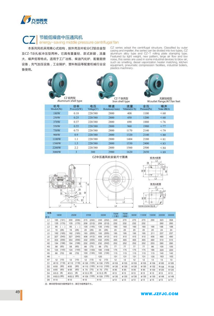 energy- saving middle pressure centrifugal fan本系列风机采用离心式结构,按外壳及叶轮分CZ铝合金型及CZ-T冷扎板冲压型两种。它具有重量轻、款式新颖,流量大、噪声