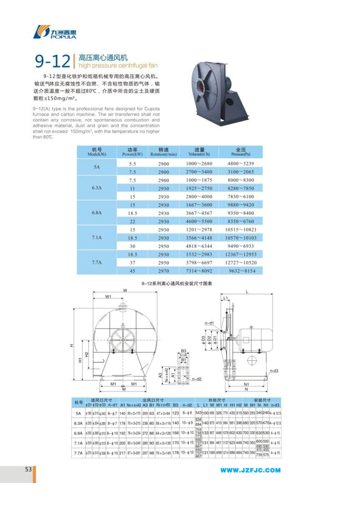 9-12型是化铁炉和纸箱机械专用的高压离心风机。输送气体应无腐蚀性不自燃、