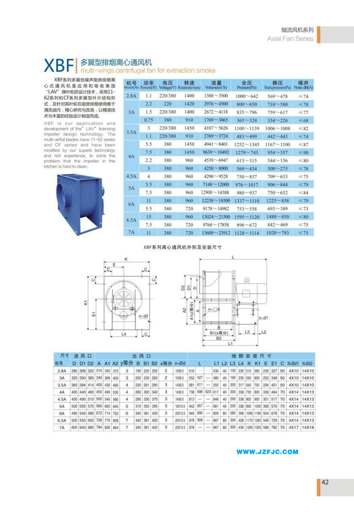 XBF系列多冀低噪声厨房排烟离心式通风机是应用和吸收美国"LAV"牌叶轮的设计技术,采用11-62系列和