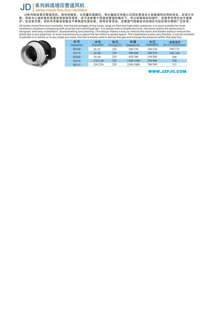 JD series mixed flow duct ventilator, has the advantages of low noise, large air flow and high static pressure, it is more suitable for mostventilation situations comparing with axial fan and centrifugal fan. It is design with a simple structure, the motor within the centre box isdesigned with easy installation, disassembling and cleaning. The design makes it easy to remove the motor and blades without remove thewhole fan or any pipelines, or even maintenance or adjust the fan within a sealed space. The installation is also very flexible, it can be installedin parallel or in series or in any angle you need, this fan is wisely used in deliver the gas and enlarge the pressure within the pipe line.